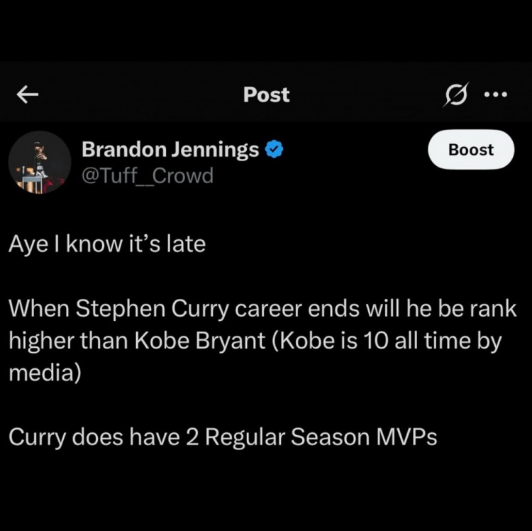 詹宁斯发问道:“当库里退役的时候,他的历史排名将高于科比(媒体将科比排在历史第十)吗?库里确实有两个常规赛MVP。”