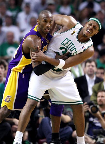 图为2008年6月5日,在波士顿进行的NBA总决赛首轮比赛中,洛杉矶湖人队球员科比(左)与波士顿凯尔特人队球员皮尔斯在比赛中拼抢位置。 新华社记者侯俊摄